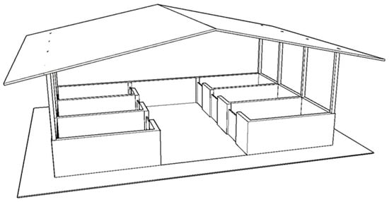 The animal housing used in this study was built along the longitudinal axis in the east–west direction; the roof was covered with ceramic tiles, the walls were built of masonry, and the floor was made of concrete and had an area of 6 m2. All stalls were equipped with feeders and drinking fountains installed 30 cm from the floor. The animals received water and balanced feed appropriate to their life stages. Figure 1 illustrates the arrangement of the stalls.