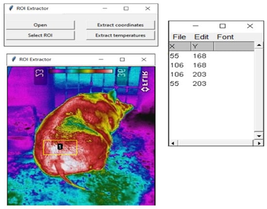 The region selected in the animals was the dorsal–caudal region. This region in pigs was also studied by the authors of [42], who evaluated the temperatures of various body regions. Ref. [5] evaluated the welfare and surface temperatures of piglets submitted to different heating systems. Ref. [20] analyzed heat-stress indicators by means of eye temperature. Ref. [43] analyzed the influence of the environment on sow reproduction. Ref. [34] studied the body surface temperature of heifers using thermal imaging.