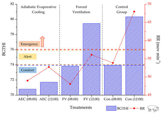 As observed, the effect of high temperatures in the facilities influenced the respiratory rate of the pigs, indicating possible heat stress. In the FV and Con treatments, as the BGTHI increased, the respiratory rate of the animals also increased.