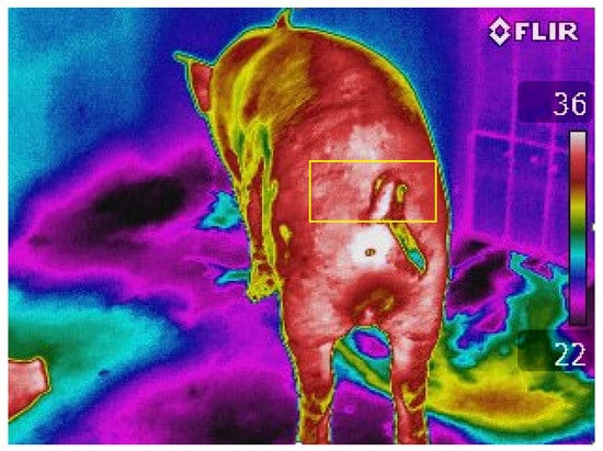 Much research has been developed using thermal imaging of various parts of animals’ bodies; for example, the authors of [28] recorded the surface temperatures of lactating sows with thermal imaging. The authors of [29] collected the temperatures of the backs, eyes, vulvas and ears of 18 pigs using infrared thermography to predict rectal temperature (°C). In [30], the authors used infrared thermography to record the temperatures of the ear and back regions of pigs. However, research on the variation in the dorsal–caudal region in pigs exposed to environments with different grading systems using infrared thermography is scarce.