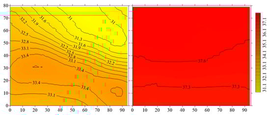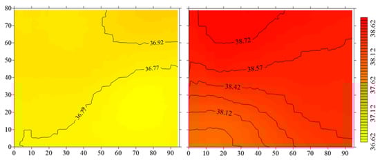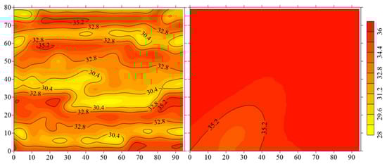 The elaborated kriging maps show the temperature distributions in the dorsal–caudal regions of the animals. Along the X- and Y-axes are the coordinates of the dorsal–caudal regions studied in millimeters. The isolines represent the estimated temperature values. These values varied from 28 to 36°C. The elaborated kriging maps showed the temperature distributions in the dorsal–caudal regions of the animals. In [24], the kriging maps also presented the distribution of air temperature values in the state of Minas Gerais. In this way, it was possible to visualize the highest temperature values in the hottest hours of the analyzed period (redder colors) in all treatments, showing the relationship between the animal’s skin temperature values and the environment.
