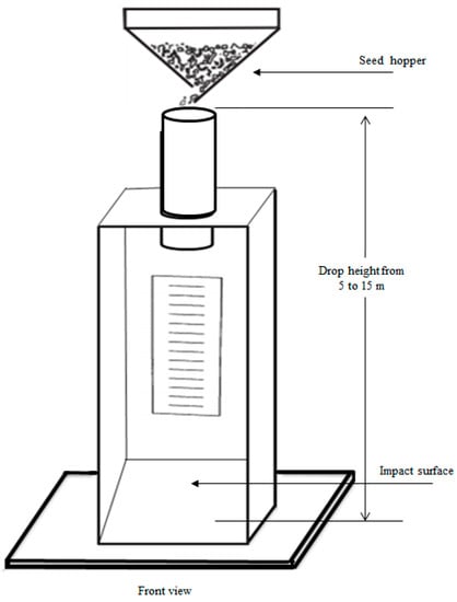 An accelerated aging test was utilized to assess the internal damage to the impacted seeds with no sign of external damage. In this regard, seeds from each test group, which showed no external damage despite the impact, were further analyzed. This procedure was designed to reveal any internal damage caused by free fall and to assess the impact of free fall on the storage viability of the seeds. For executing the accelerated aging test, different seed samples (namely, free fall treated and control specimens) weighing forty grams each, were placed in a chamber at 42 °C and a humidity level of 100% for a duration of 72 h. Subsequently, these samples were subjected to a standard germination examination [28,29]. The loss in germination percentage (PLG) was calculated based on the difference between the germination percentage of free fall treated and control samples. Total damage was calculated as the sum of the physical damage and physiologic damages [30].