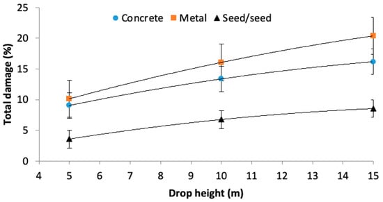 At 20 °C and an MC of 10%, seeds dropped from a height of 15 m, resulted in an average total damage of 23.53% on metal, 15.71% on concrete, and 8.09% on seeds. While at −10 °C and 10% MC, and a drop height of 15 m, the total damage was as high as 29.21% on metal, 22.37% on concrete, and 13.04% on seeds.