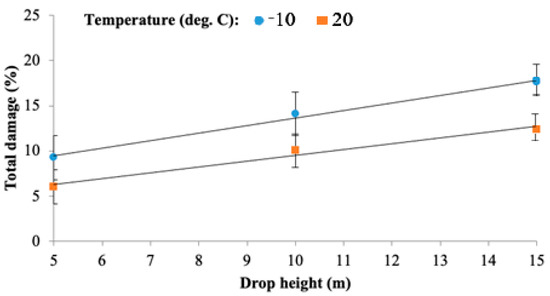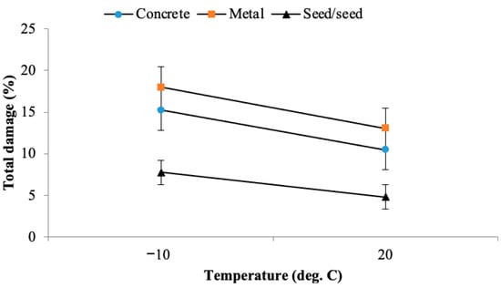 Figure 3 shows the effect of the interaction of impact surface and ambient temperature on the total damage to corn seeds. The difference in total damage was lower when seeds were dropped on seeds, compared to seeds dropped on either metal or concrete at a higher temperature (20 °C) as opposed to a lower temperature (−10 °C).