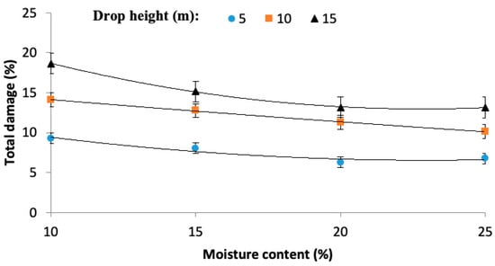 Total induced damage to corn seeds under synergistic effects of drop height and moisture content.