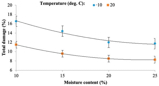 Figure 7 displays the interaction between temperature and MC on total corn seed damage. Generally, the total damage incurred by corn seeds was less at 20 °C than at −10 °C. The relationship between total damage to seeds (TD, %) and MC (%) was denoted by the subsequent best-fit equations for temperatures of 20 °C and −10 °C, respectively: