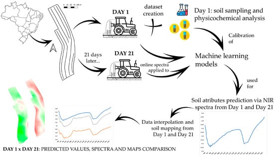 An adjacent research area was started trying to adapt the DRS NIR for proximal soil sensing (PSS) [17], acquiring soil spectra direct from agricultural areas in high spatial density, the so-called online spectra [18,19,20]. Jointly with the introduction of machine learning (ML) techniques to quantify soil attributes using DRS [21,22], the online spectra with soil laboratory analysis as reference values allow training models that will later only need the soil spectra to predict the attributes in the field. The possible advantages are the primary goals of acquiring soil data faster, reducing the cost of acquisition per sample, the laboratory reagent waste, and the laborious work that laboratory spectral analysis demands, such as soil drying, grinding, and sieving.