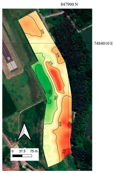 The area presents a mid-west highest point of 586 m, with a declivity direction to the south, with the lowest point of 576 m. Two north–south terraces divide the area and delimit the lowest portions at the east. The north portion of the area is a plateau with low altitude variation (Figure 2). The altimetry map was generated due to water topsoil dynamic dependence of altimetry [32,33,34] since soil moisture is known to affect NIR spectra [35,36].