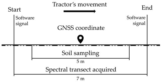 Soil sampling occurred on day 1 and was used as reference values to compose the dataset for ML model calibration and evaluation. The soil was sampled in the bottom of the furrow left by the subsoiler shank in the spectral acquisition transect to ensure that soil analysis was correspondent to the area previously sensed. For this, the spectrophotometer acquisition time of one spectrum (10 s) was multiplied by the operation speed, resulting in the transect length sensed (7 m). As the spectrophotometer acquisition software indicates in real-time the starting point of each spectrum, the demarcation of 72 random starting points allowed the afterward soil sampling. To reduce uncertainty, one meter was removed from the beginning and end of each transect sampled, resulting in a five-meter-long soil sample along the furrow (Figure 3). Soil analysis in the laboratory was conducted following the methods described by Teixeira et al. [37]. The attributes and respective analysis methods considered were: clay (HMSF + NaOH); OM (oxidation); CEC, the sum of basis (resin) plus soil total acidity (KCl); pH (CaCl2); P, K, Ca, and Mg (resin).
