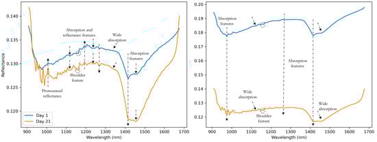 The mean spectra from day 1 and day 21 showed that the intensity of reflectance was higher on day 1 (Figure 6), corroborating the spectra intensity observed for the highly correlated population and the possible implication of the higher soil moisture observed in the acquisition of day 21.