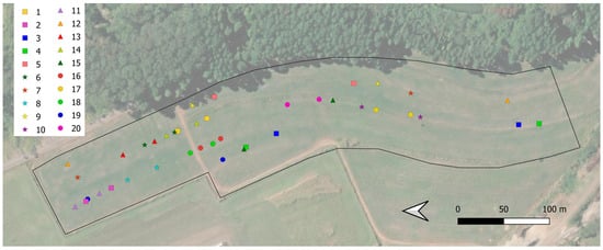 Distribution of the 20 highest correlated spectra pairs (day 1 vs. day 21) in the experimental field. Equal geometric shapes with the same color represent the acquisition location of the corresponding pairs (one spectrum from day 1 and its corresponding spectrum from day 21).