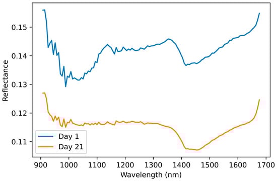 Mean spectra from day 1 and day 21 representing the intensity of reflectance on each acquisition day obtained by averaging the reflectance values of the wavelengths read by the sensor.
