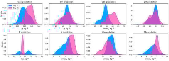 Kernel density estimation plots of clay, organic matter (OM), cation exchange capacity (CEC), potential of hydrogen (pH), phosphorus (P), potassium (K), calcium (Ca), and magnesium (Mg) predicted using the 140 online spectra from each acquisition day.