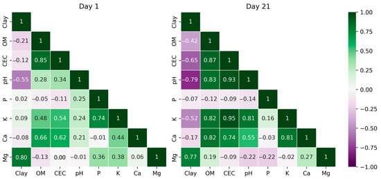 Pearson’s correlation among clay, organic matter (OM), cation exchange capacity (CEC), potential of hydrogen (pH), phosphorus (P), potassium (K), calcium (Ca), and magnesium (Mg) predicted using online NIR spectra from day 1 and day 21 acquisitions.