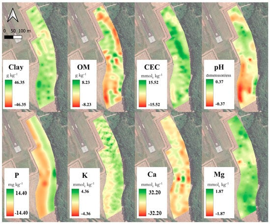 Maps of clay, organic matter (OM), cation exchange capacity (CEC), potential of hydrogen (pH), phosphorus (P), potassium (K), calcium (Ca), and magnesium (Mg) demonstrating the spatialization of the differences observed in the predictions of the two days, calculated by subtracting Day 21—Day 1.