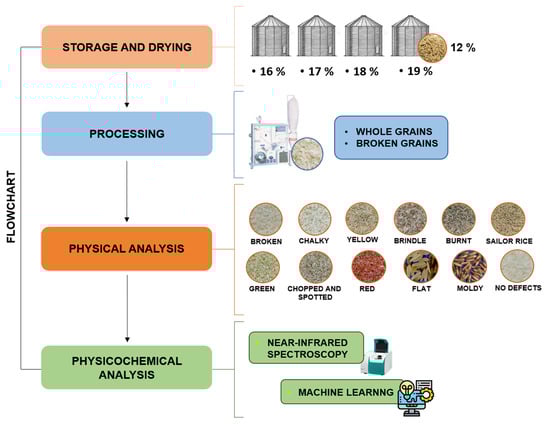 - Nunes, M.T.; Coradi, P.C.; Muller, A.; Carneiro, L.O.; Steinhaus, J.I.; Anschau, K.F.; Souza, G.C.; Müller, E.I.; Teodoro, P.E.; Dutra, A.P. Stationary rice drying: Influence of initial moisture contents and impurities in the mass grains on the physicochemical and morphological rice quality. J. Food Proc. Preserv. 2022, 46, e16558. [Google Scholar] [CrossRef]