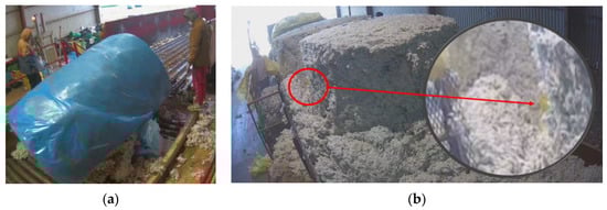 Module feeder floor system: (a) unloading of round module onto module feeder floor; (b) where module accidentally tipped over trapping plastic underneath it so that the crew couldn’t remove the tail. Whenever this situation occurred, the gin crew wasn’t always able to remove all the plastic before it went into the gin.