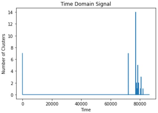 To enable the current semi-automatic calibration system to become fully automated, the primary impairment to fully automatic operation is how to automatically collect images of cotton that are free from plastic. To aid in the development of this algorithm, the research placed 10 detection systems into 2 commercial cotton gins and tracked plastic detection events throughout the 2021–2022 cotton-ginning season. Each detection system was carefully calibrated using expert operators to assess the images used by the machine-vision system’s software (Pelletier et al., 2021 [9]). The machine-vision software was configured to save all detected plastic images and ttrack the time and date of each plastic detection event, hereafter referred to as an “Event”. After the ginning season ended, the data were analyzed to assess the potential for finding a means to provide separation that would allow an auto-classification algorithm to gather ongoing cotton images while avoiding plastic images, which would degrade the classifier’s performance. The separation method of interest utilizes frequentist statistics, similar to how music or communication systems remove the effect of key frequencies utilizing frequency domain filtering. To assess this potential exclusion mechanism, the observation time of each event, for a single day, was plotted (Figure 3). From this observation, it is clear the events are not uniformly spaced but instead occur in clusters.