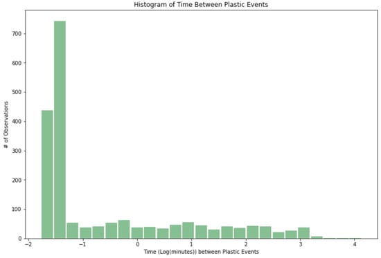 To observe the clustering nature of the events, the event time log was converted to time duration since the last plastic event. A histogram of this data is plotted below and shown in Figure 4. Due to the very wide span in observed durations, ranging from secs to numerous hours on some occasions, the time data was plotted on a log scale to allow for better observation of the occurrences. From this, it is apparent that once the timespan exceeds 1 min, the number of occurrences is fairly uniform. This is fortuitous as it provides flexibility in the selection of the cluster observation window, for use in the design of an algorithm.