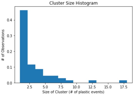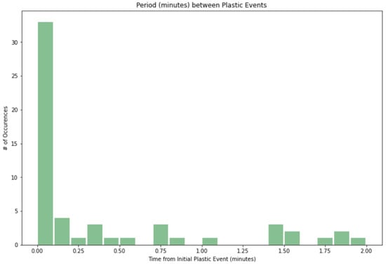 To assess the clustering of plastic events, commercial observations of plastic event logs were assessed using a sliding observation window (in time). A preliminary survey of the data suggests similar statistics, number of occurrence events per minute, as the window size changes from 1 to 20 min. As the longer the window duration, the greater the number of plastic events; then to exclude the plastic based upon occurrence differences, the algorithm will have to use a much larger number of images. To strike a balance, a two-minute window was selected as it provides a reasonable duration in which to collect a sufficient number of images to build a reasonable calibration, while not having so many images to analyze that it impacts the processing power of the machine-vision node. The start of a cluster was noted by a pause greater than the window duration, and then all subsequent plastic events, for the duration of the window, were assigned to that cluster group. In assessing the clustering, a histogram of time from the initial plastic (at the start of the cluster) is shown in Figure 4, which was constructed using a two-minute sliding window to assess clusters. In the time domain, Figure 5 shows the time positioning and size of clusters (also using a 2-min sliding observation window).