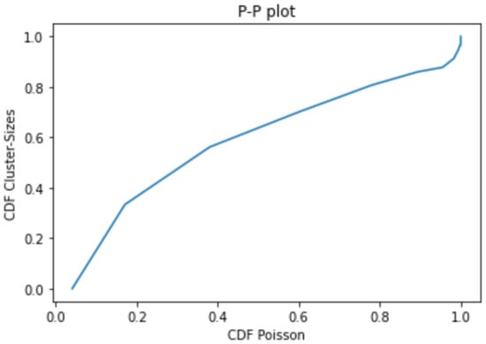 To assess if cluster sizes followed a Poisson distribution, the experimentally observed distribution of the cluster sizes was compared to several types of standard statistical distribution functions. To assess the type fit to a particular distribution, a z-test was performed. Results comparing a Poisson distribution to the experimentally observed cluster sizes, with a two-minute window, were found to be statistically the same, with a z value of 0.0027 (z > 2.5 is required to reject the null hypothesis that groups are the same). A visual confirmation is also provided, by means of a probability-probability (P-P) plot, which compares the cumulative distribution function for a Poisson-Distribution versus the distribution found experimentally from the clustered plastic events, which is shown in Figure 7.
