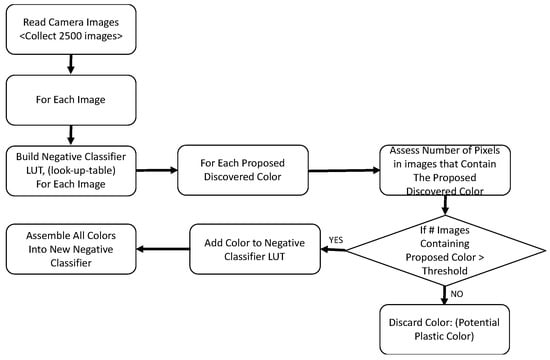 The protocol for the auto-calibration algorithm starts with the build-LUT (look-up-table) routine, from the negative classifier (Pelletier et al., 2021 [9]). For each image collected over the two-minute window, the build-LUT routine analyzes all the colors in the image and notes them as colors to ignore in the LUT it creates (that is used for later image classification for plastic detection) and returns to the calling auto-calibration routine. The auto-calibration algorithm routine then takes the returned LUT and adds each color to build a histogram of the number of occurrences for each color. The algorithm restricts each color occurrence, from a single image to only count once in this histogram, regardless of how many times it occurs in any one image. Hence, a given color only counts once per image. This is repeated for each of the images that are collected over the two-minute window. Once all the colors, from the LUTs from each of the images are added to the histogram, a threshold of 45 is applied to each color as the threshold for entry into the working classifier’s LUT. For clarification on the details, Figure 8 provides a flowchart of the auto-calibration LUT build protocol.