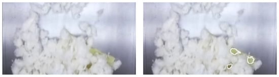 For assessment of the efficacy of the auto-classifier to detect plastic contamination effectively, the auto-classifier generated LUT, with k = 45, was used to classify a pool of images with yellow plastic contamination. The auto-classifier built LUT detected 1405 plastic contamination images in this dataset. The classifier was then rebuilt with k = 1, effectively turning off the auto-classifier constraint yielding a normal classifier build. By comparison, the normal classifier built LUT also detected 1405 plastic contamination images (area-threshold = 100). This was repeated with area-threshold = 500, where the number of plastic images was found to be 1350, again for both the auto-classifier as well as normal build. Of note is that increasing the area-threshold criterion to 500 resulted in a reduction of 4% efficacy that is exchanged for the elimination of false-positives, “FP (FP increases to 3 for 2400 image calibration set). It is the authors’ belief that this is an important trade-off as over a two-minute window, an FP rate of 3 is 1.5 plastic ejections per minute (90 per hour), which causes too much work for the gin personnel, which then runs the risk of having gin personnel just turning off the system. As such, the area threshold of 500 is the current value that has been used in commercial prototypes as well as the units that were transferred to commercial partners for sale into the ginning industry. It is one area, though, that would be of interest to examine further if one were trying to get a bit more performance out of the system.
