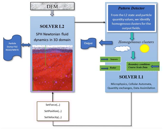 The initialization of Solver L2 involves reading an ASCII DEM that will serve as the orographic domain of the simulation. The particles are positioned uniformly on the scene and evolve until a point of stability is reached. Solver L1 processes the initial conditions obtained from measurements, such as sensors or radar, and provides directives for assigning forces, velocities, and positions to particles in specific spatial volumes (clusters) to Solver L2. L2 evolves by applying these directives for a specified time interval, and Solver L1 is informed of the new state of particles at the end of the evolution, including their position, velocity, density, and changes compared to the previous state. Solver L1 then associates the attributes provided by L2 with particle and atmospheric state-related characteristics such as humidity and temperature. The pattern detector (part of L1) creates clusters with homogeneous atmospheric characteristics such as cloud cover, rain, humidity, average temperature, and pressure from the states provided by Solver L2. The values referred to as clusters are the output provided by the simulator.
