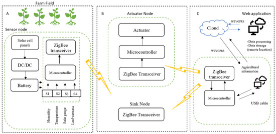 The elements that constitute a sensor node are mainly sensing, storage, processing, and communication capabilities, as shown in Figure 4. Part A is composed of several sensors, such as a temperature sensor, humidity sensor, rain sensor, leaf wetness sensor, ZigBee protocol [24,25,26], ATmega128L microcontroller, and solar cell module, that support this WSN. Communication protocols play a major role in intelligent IoT-based agriculture and cover short or long distances for smart farming. Wireless protocols/technologies that are used in agricultural applications are, for short distances, ZigBee and Wi-Fi, and for long distances, mobile communication networks, long-range wireless area networks (LoRaWAN), Bluetooth, and LPWAN protocols. Among microcontrollers, the most used in agriculture are ATmega128L nodes because this microcontroller supports multi-level data aggregation, decision making, storage capabilities, flash memory, low complexity, and energy management. Traditionally, batteries limited in size and capacity influence the lifetime of WSNs. Today, solutions such as the combination of ultra-low-power nodes with energy-harvesting techniques make WSNs perpetually operational. Part B indicates two components—special nodes usually called sinks, hubs, or gateways in the literature, depending on their function—are added when the network needs to coordinate or communicate with an external network. Actuators allow for indirect intervention in the operation or control of mechanisms. The sink node passes all information to the cloud platform. All sensor, sink, and actuator nodes adopted the low-power ZigBee wireless protocol. This information obtained from sensors and governed by actuators is then transmitted via a gateway to cloud computing for data processing and storage, as shown in Part C. The task of the gateway is to collect information from various sensors and pass the information to the cloud server [27,28,29,30,31,32,33].