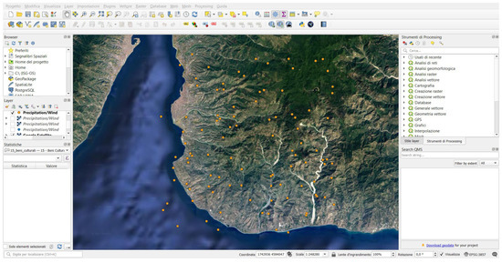 In our research, GIS plays a central role in the management of the information collected from different sources and in the return of important information related to Agriculture 4.0. In fact, the choice of the optimal areas for cultivation depends on several factors that can affect the yield and quality of the crop, which include climate, type of soil, irrigation, topography, and market needs. In the following study, QGIS (an open-source GIS) was used, which consists of software that allows one to process, display, and analyze geographic data such as maps, satellite images, sensor data, etc., using the Python language. This type of software, which is entirely updatable, has therefore allowed the automation of the management of geographical data, the creation of customized scripts for data analysis, and the creation of customized tools for data visualization.