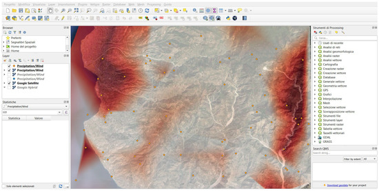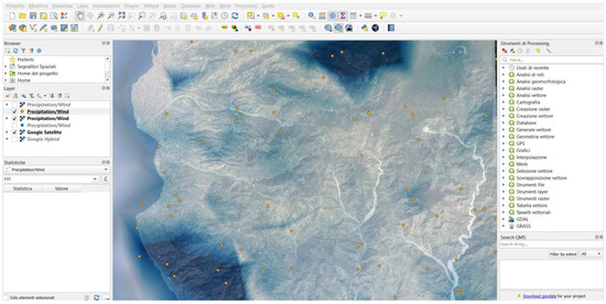 Once the software is running, the Pattern Detector (part of Solver L1) creates clusters with similar atmospheric characteristics, identifying rain, humidity, wind, pressure, etc. Each punctual value, referred to as Clusters, is the output provided by the simulator, which is then imported into the GIS. Below, it shows an example of the extrapolation of the precipitation and wind values represented in Figure 6 with dots within the area of the case study. One hundred dots with the respective values of these climatic variables were produced by the simulator and reported to the GIS. In the specific case, the values obtained (also validated with the local sensors considering a tolerance of 10%) varied in a range between 0 and 4 mm for the precipitation and in a range from 0 to 55 km/h for the gusts of wind.