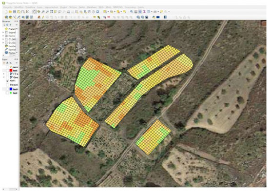 Once the data were collected from the multiple sources, we were enabled to identify using the open-source GIS, in relation to climate parameters, sensor values, and indices deriving from satellite and UAV images (wind, soil type, soil moisture, NDVI…), different types of areas suitable for the cultivation indicated with different capital letters (A, B, C, D…) and grouped for simplicity of treatment according to the parameters useful for the particular types of crops. Specifically, the available data have made it possible to identify in the study area exclusively three types of classes (A, B, and C) reported with different colors. Typology A (orange color): cultivation areas suitable for crops that do not need continuous irrigation. Typology B (green color): cultivation areas suitable for crops that need continuous irrigation. Typology C (yellow color): cultivation areas suitable for trees. Figure 10 shows the three different typologies of cultivation.