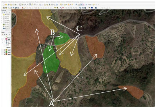 GIS showing the three different typologies of cultivation, A, B, and C, reported in three different colors (letters and arrows are superimposed on the original image to better visualize the different typologies highlighted: typology A (orange color) represents cultivation areas suitable for crops that do not need continuous irrigation; typology B (green color) represents cultivation areas suitable for crops that need continuous irrigation; typology C (yellow color) represents cultivation areas suitable for trees.