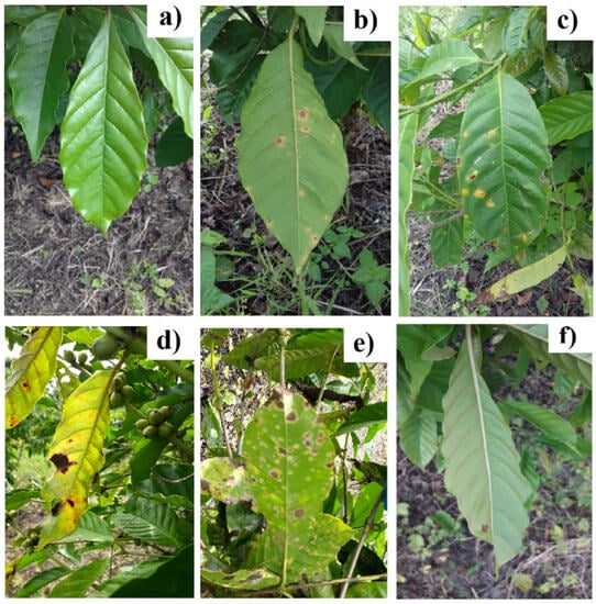 In Figure 1a, healthy coffee leaves are observed. However, once infected, small lesions of light-yellow color appear on the undersides of the leaves, as shown in Figure 1b. These lesions grow and start producing orange spores that cover almost the entire surface of the lesion (Figure 1c). As the lesions continue to expand, they merge. The center of the spot eventually dries up and turns brown, while the edges of the lesions continue to spread and produce new spores (Figure 1d,e). Eventually, the affected leaves fall off, leaving the branches without foliage [22,24].