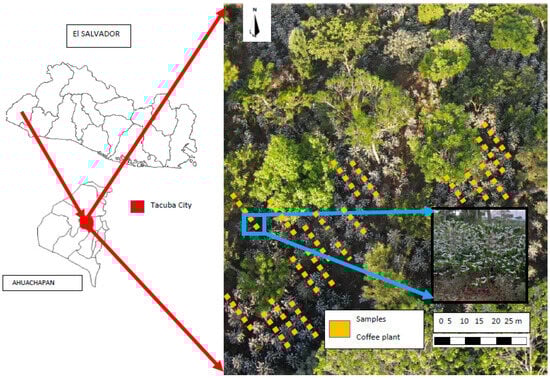 The study area is situated in the department of Ahuachapán, El Salvador, with co-ordinates 13°53′47.2344″ N, −89°52′14.217″ W (Figure 2). Ahuachapán exhibits a tropical climate, characterized by significantly higher rainfall in summers than in winters. It falls under the Aw category according to the Köppen–Geiger classification. The average temperature is 21.9 °C and the annual average precipitation reaches 1544 mm. Throughout the year, there is a temperature variation of 2.1 °C. The average elevation in the study area is approximately 900 m above sea level.