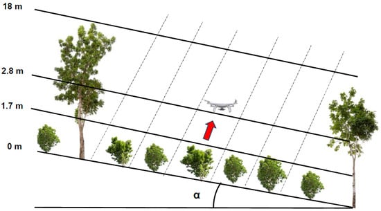 Average height of the trees in the area, the coffee plantation, and the UAV flight. The slope of the terrain varies (α). The red arrow indicates the UAV’s flight direction, and the dashed lines show the direction of the planted furrows.