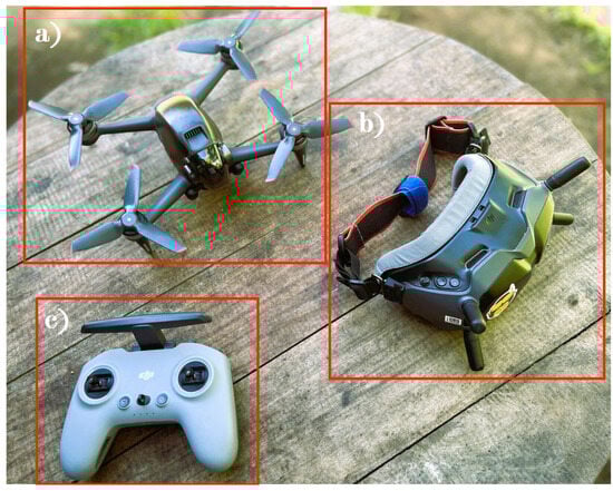 Equipment used for image collection. (a) DJI FPV drone; (b) DJI FPV Goggles; (c) DJI FPV Remote Controller.