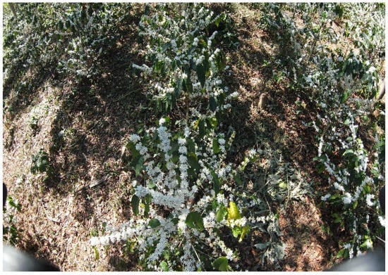 The coffee crop under study is Arabica (Coffea arabica L.), specifically the Bourbon variety. It occupies an area of 75 hectares. Cultural practices are carried out annually, which include removing damaged branches. The trees’ canopy, responsible for providing shade to the crop, undergoes pruning every 2 years, with the objective of maintaining a shade (40%)–sunlight (60%) ratio. These trees are endemic to the region and belong to different species, with an average height of 18 m (Figure 3).