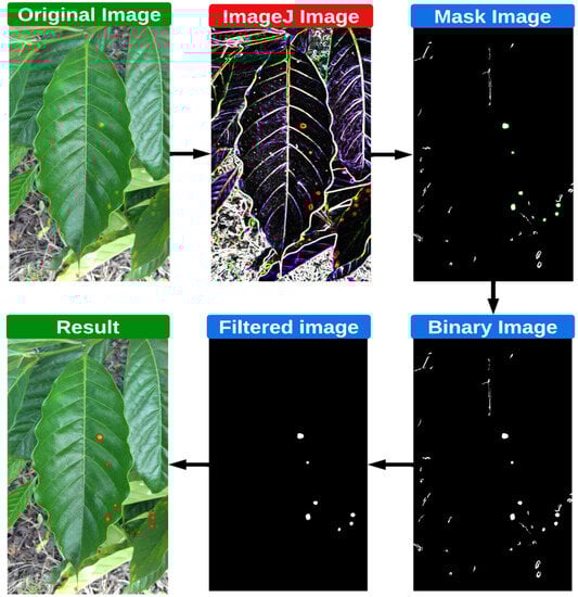 Next, the images undergo processing in the Python-based rust detection algorithm (Figure 6). This algorithm’s objective is to create a mask that identifies the presence of red and orange colors in the image obtained from ImageJ. This software automatically marks the detected variations on the processed image. It was observed that, in the case of coffee leaf rust, it consistently followed a color pattern (red and orange) that formed a circular structure. The “cv2.findContours” function from the Python OpenCV library was employed, which relies on the topological information and pixel connectivity within the image. The algorithm searches for initial contour points and proceeds to track neighboring pixels, forming a point sequence that represents the contour. Finally, a binary image is generated to visualize the identified regions.