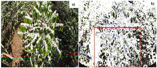 Image segmentation of UAV-captured images. (a) Original image; (b) image processed with ImageJ software. The red box indicates the segmented area used in the developed method.
