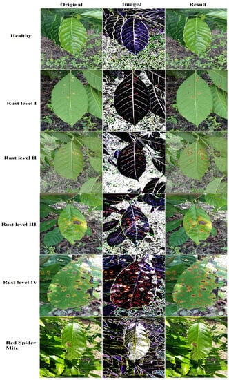 RoCoLe provides six categories: healthy, rust level I, rust level II, rust level III, rust level IV, and presence of red spider mite. For each class, there are 791, 344, 166, 62, 30, and 167 images, respectively. This database was selected to be used in this work because it is widely employed in the development of algorithms for CLR detection. This will enable a comparison of the performance of the developed method with others created for the same purpose [21].