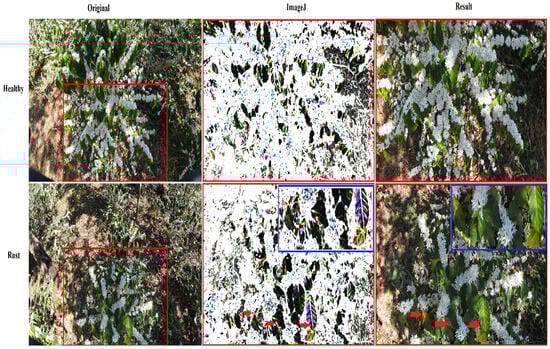 Using the DJI FPV UAV, images of Bourbon coffee plantations were obtained. In this work, the designed method focuses on the detection of CLR, not on its classification. Figure 10 shows the results achieved by applying the developed method to the acquired images. The segmentation of the original image into a smaller one enhanced the algorithm’s efficiency in detecting the presence or absence of the disease. The developed method achieved an efficiency of 93.75%. By applying the Cohen’s kappa method, a κ = 0.954 with p < 0.001 was obtained in the entire study.