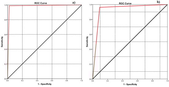 The ROC curves presented in Figure 11 illustrate the performance evaluation of the developed method. For the RoCoLe dataset (Figure 11a), the method showed excellent predictive performance, with an area under the curve (AUC) of 0.983, indicating a high discrimination capacity between positive and negative classes. The results were statistically significant (p < 0.001), with a 95% asymptotic confidence interval ranging from 0.976 to 0.991.