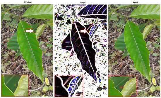 The developed method exhibited similar failures in detecting rust in the images acquired using UAV, comparable to those observed in the RoCoLe dataset. However, it still demonstrated the ability to distinguish coffee leaf rust in the field, as evident in Figure 8, Figure 9, Figure 10 and Figure 12. In ImageJ, the variance filter mainly identifies weeds, furrows, and tree trunks as white, while only structures with different colors are detected in the crop foliage. Yellow leaves that are drying out or damaged, such as those affected by the red spider mite, are not identified by the developed method as possible CLR (Figure 8). Moreover, it was confirmed that the shadows of the trees do not significantly influence the results of the images taken by the UAV (Figure 10).