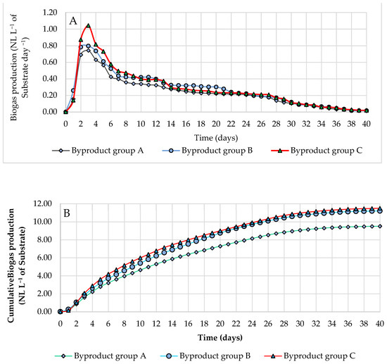The biogas potential of the tested byproduct groups collected from raisin production stages was assessed. The average values of daily biogas production of each byproduct group are presented in Figure 3A. Daily biogas production started on the first day of digestion with peak production in the first 6 days. The biogas production decreased until it reached almost zero after 40 days, showing a similar trend for the three tested byproduct groups A, B, and C. The highest daily biogas production rate reached 1.04, 0.80, and 0.74 NL L−1 of substrate day−1 on the third digestion day for byproduct groups C, B, and A, respectively. The daily biogas production started to decrease during the period of 7–30 days, with production fluctuating from 0.49 to 0.11 NL L−1 of substrate day−1 for byproduct group C, and from 0.44 to 0.12 NL L−1 of substrate day−1 for byproduct group B, and from 0.40 to 0.10 NL L−1 of substrate day−1 for byproduct group C. Generally, there was a sharp increase in biogas production in the first three days of the AD process, followed by a gradual decline until there was no production. The availability of substrates at the early stages of AD could be a factor, and as AD progressed, the substrates on which the microorganisms could feed were depleted [46]. The patterns in average daily biogas production for each byproduct group were very similar to those reported by Olugbemide and Likozar [47].