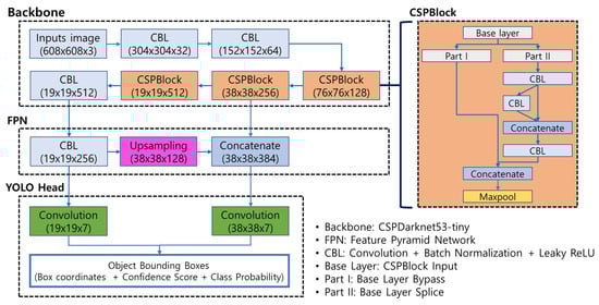 Figure 1 shows the schematic structure of YOLOv4-Tiny. The basic configuration of the network consists of a CNN-based neural network module as the backbone, an FPN module, and a YOLO-head module. The backbone extracts the main features of an object from the input image, and the FPN module improves feature extraction performance by merging functions of various layers. The YOLO-head module outputs object prediction results of multiple sizes. The CNN-based backbone is designed by repeating convolution-batch normalization-LeakyReLU (CBL) block and cross-stage partial (CSP) block. Still, compared to YOLOv4, the overall network is lightweight by reducing the number of iterations and compressing in block units. YOLOv4-Tiny simplifies the YOLOv4 network and greatly reduces the network size, resulting in slightly lower detection accuracy, but speedy learning and detection speed [,,,,]. Therefore, if object detection accuracy can be improved, it can be used as a beneficial network.