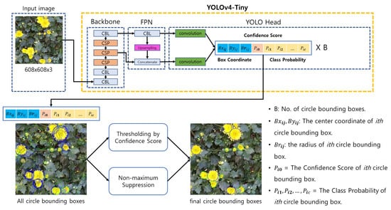 Figure 2 shows a schematic of the YOLOv4-Tiny detector detecting the degree of flowering of chrysanthemum flowers. When an image is an input to the YOLOv4-Tiny network, the location information of the chrysanthemum petal predicted through YOLOv4-Tiny is output, and the object overlap test and final class is output. The YOLOv4-Tiny network extracts object features through the backbone network and FPN (feature pyramid network). The predicted chrysanthemum flower information is output through the YOLO head. In this study, the input image size is (608 × 608) pxl, and the CSPdarnet53-Tiny model and FPN structure are applied as a network for feature extraction. The output structure of the YOLO head consists of the coordinates of the center point of the bounding box (A, B) representing the location and size of the cBBox, the circle radius (r), the confidence score, and the class probability. Non-maximum suppression (NMS) is applied to the same class to remove redundant detection among the values output by the YOLO head. If different classes are predicted, the class with the more significant confidence score is selected and determined as the final output.