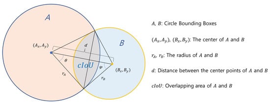 Figure 3 shows two cBBoxes, A and B, of different sizes, where and are the radii of A and B, respectively. If the distance (d) between the center points of the two circles is , the two circles overlap. The overlapping area of the two cBBoxes is given by Equation (1):