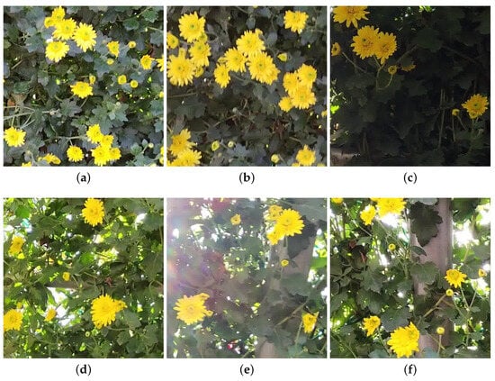 There is no open dataset for chrysanthemum petals, so images obtained by direct filming were used. The images of chrysanthemums used in this study were extracted from videos taken with a tablet (Samsung S8 Ultra: Samsung Electronics in Korea) with a built-in camera at the Jinju Chrysanthemum Exhibition in November 2022. The video was filmed at FHD (1920 × 1080 pixels) at 30 fps under natural light conditions, the same chrysanthemum species were selected, and images were extracted considering different brightness and environmental conditions. Training and test images were collected. The extracted images were cut at a resolution suitable for learning (608 × 608 pixels) to create 117 training and test images. We randomly selected 82 images for learning and 35 as test data for the performance evaluation. Figure 4 shows a part of the extracted image. For the fairness of network performance evaluation, the images were composed of images with different brightness and sharpness. Figure 4a,b are images taken under natural light conditions, but Figure 4b is a very defocused image. Figure 4c is a very dark image taken in the shade, and Figure 4d–f are images taken under backlight conditions.