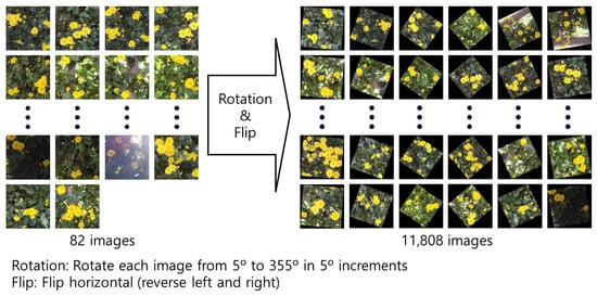 Eighty-two training images for YOLO network learning are insufficient for training data, and overfitting may occur during network learning. Therefore, data augmentation is required for improved detection performance and practical training. Most flower objects in the image are circular and have a consistent object image with a change in angle. Therefore, the images of the prepared data were applied to increase the number of data while maintaining the object characteristics in the image through inversion and rotation. In the case of rotation transformation, the data augmentation effect was maximized by converting only the object’s size and position while maintaining the object’s characteristics by setting it to not deviate from the 608 × 608 input image size using a scale factor. In other words, rotation alone has the effect of changing the sizes and characteristics of an object. For image rotation, 82 image data were expanded to 11,808 by rotating and converting the original image and the inverted image to degrees at intervals of degrees. Figure 5 shows the data augmentation process.